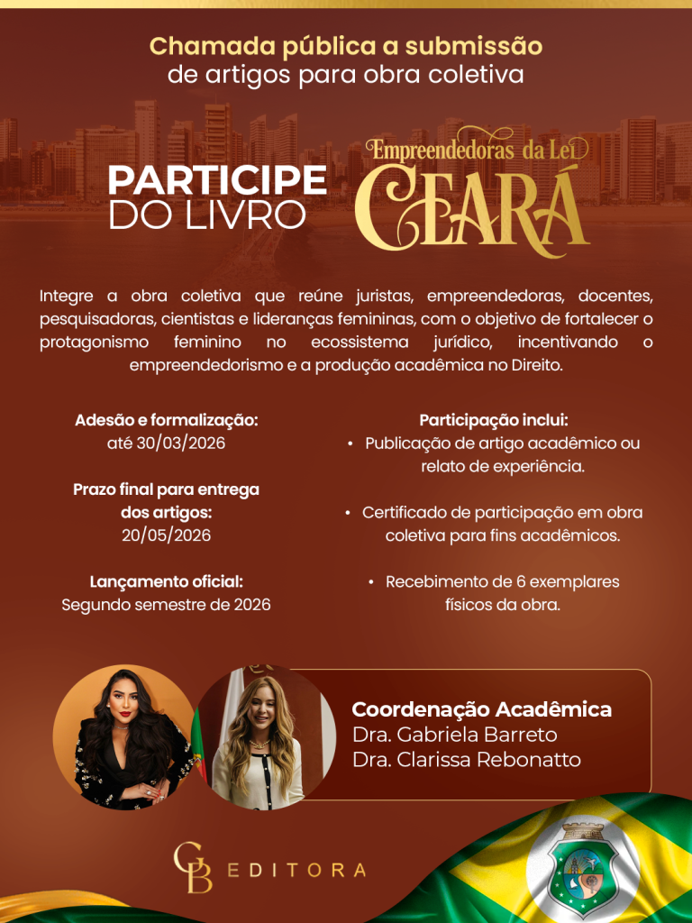 Com o objetivo de valorizar a atuação feminina no meio jurídico e incentivar a produção acadêmica no Estado, está aberto o edital de chamada pública nº 02/2026 para a obra coletiva “Empreendedoras da Lei no Ceará”. A iniciativa conta com o apoio da OAB Ceará e da Escola Superior de Advocacia do Ceará (ESA-CE) e propõe reunir artigos científicos e relatos de experiência de mulheres com atuação de destaque no cenário jurídico cearense.