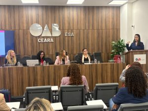 de autoria da advogada e membra da CMA, Eva Aguiar. Na sequência das palestras, os temas abordados foram: “Audiências em casos de violência doméstica”, com a juíza titular do Juizado da Violência Doméstica e Familiar Contra a Mulher da comarca de Caucaia, Deborah Salomão; “Prática de produção de provas e ônus probatório”, ministrada pela presidente da Comissão de Processo de Família do IBDFAM-CE, Angélica Mota e “Tecnologia para acompanhamento de dados atualizados de casos de feminicídio”, proferida pelo juiz de direito do Tribunal de Justiça do Ceará, Tiago Dias.