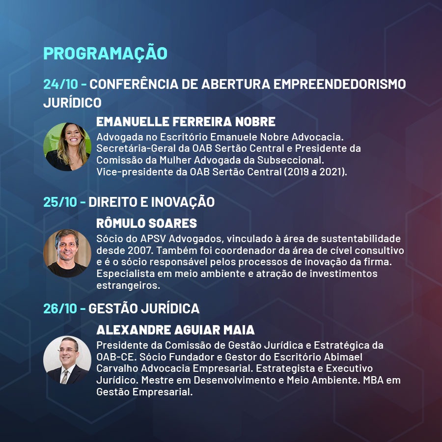 Confira a programação completa com os respectivos palestrantes: