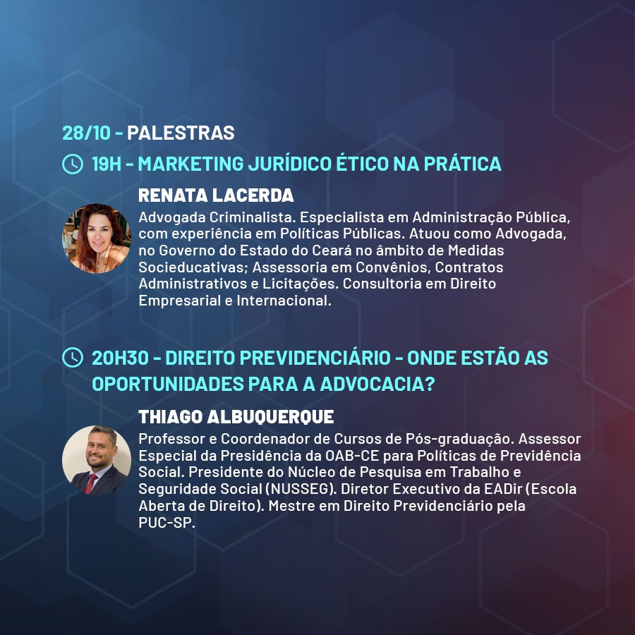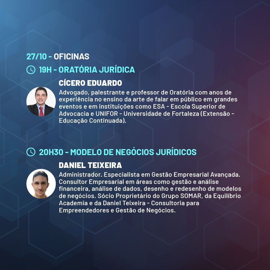 A programação também contará com oficinas práticas com foco na oratória e na elaboração de modelos de negócios jurídicos.
